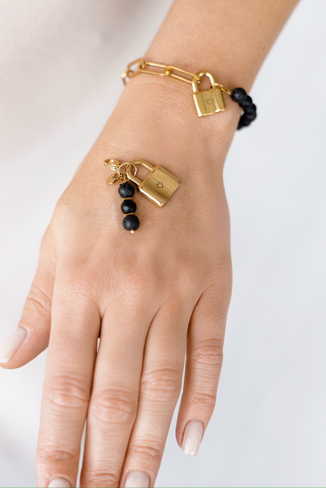 Kłódka z grawerem i kamieniami naturalnymi: Onyksem, Hematytem i Lawą wulkaniczną