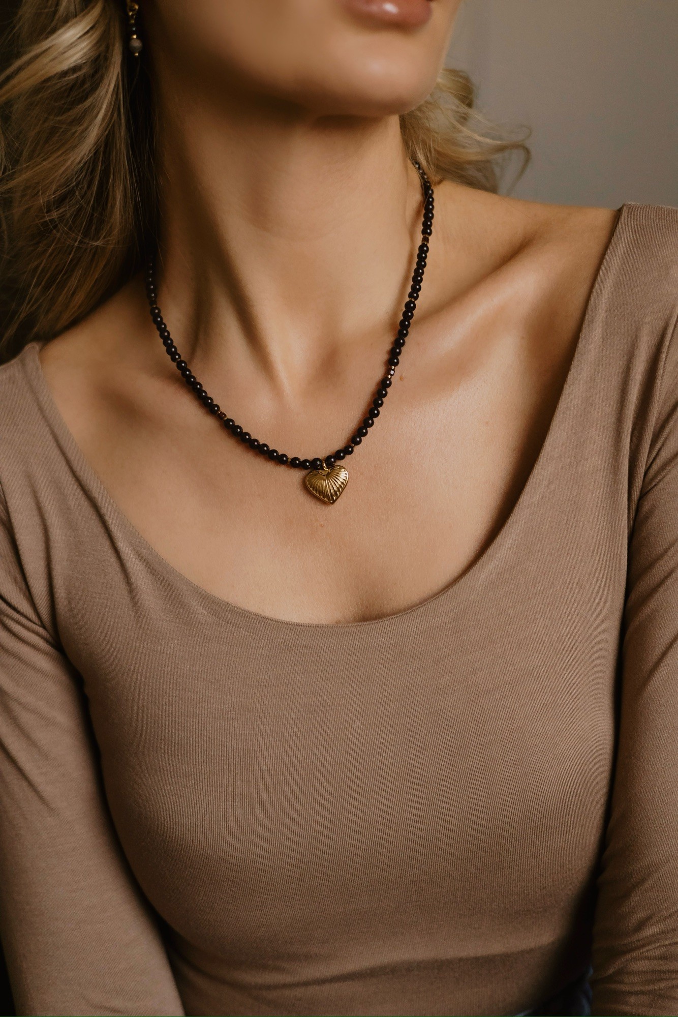 Naszyjnik posiada przywieszkę w kształcie serca.