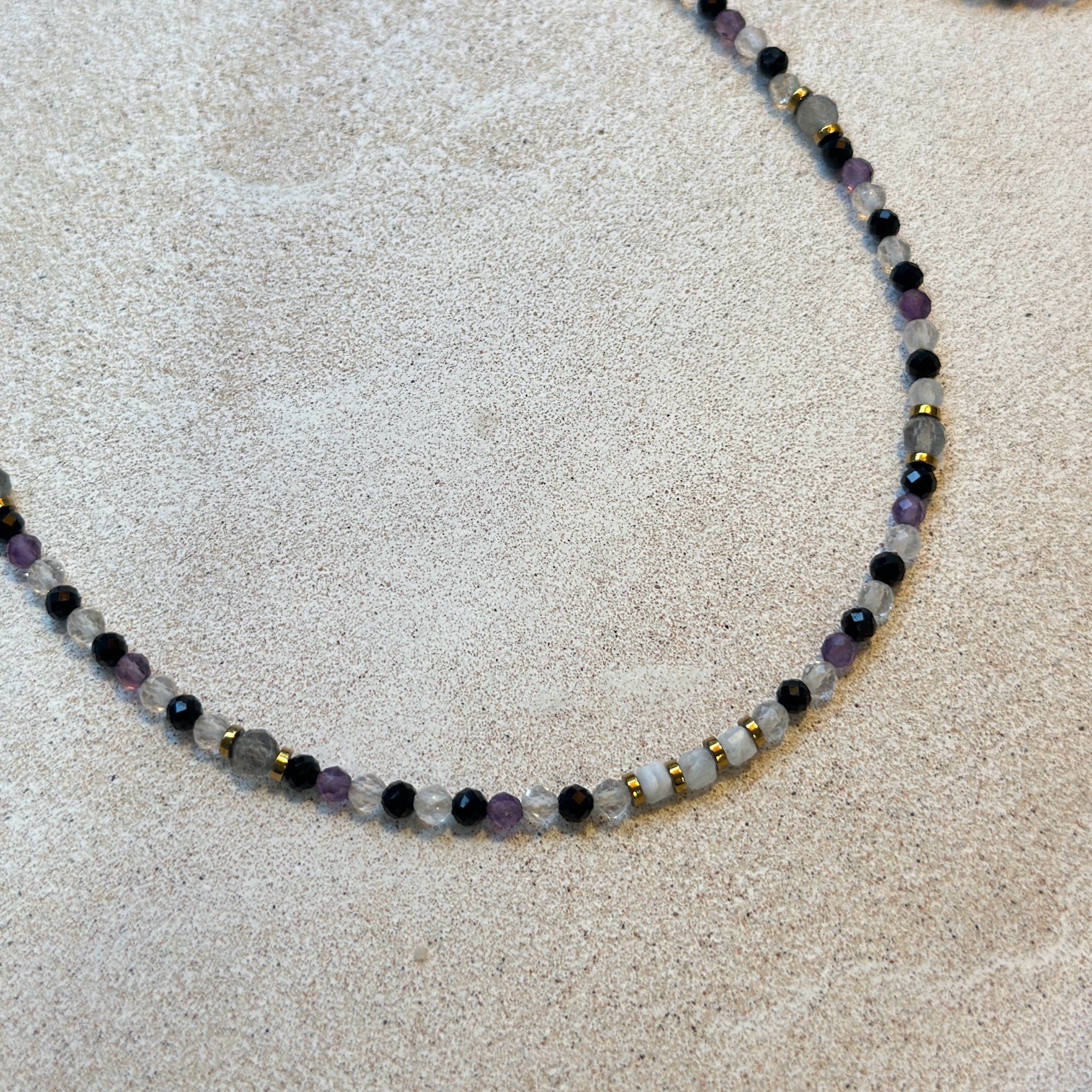 Naszyjnik typu choker New Moon – kamień księżycowy, turmalin, kryształ górski, ametyst, labradoryt